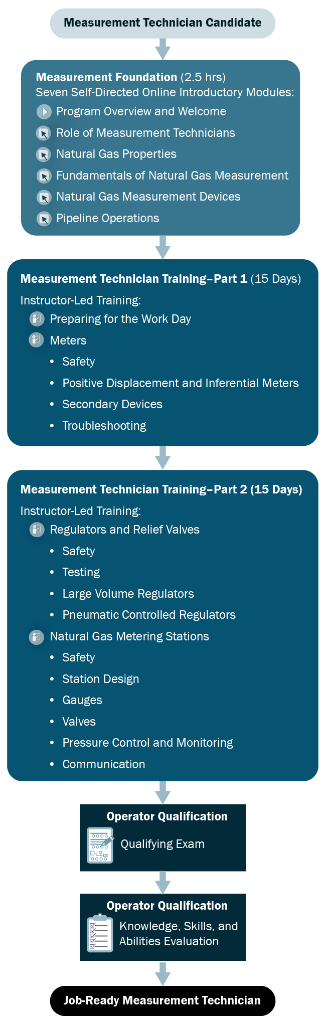 We identified the competencies that measurement technician and corrosion technician candidates must master to pass the operator qualification written examinations and skill evaluations for those roles by reviewing corporate policy, industry, and regulatory resources: